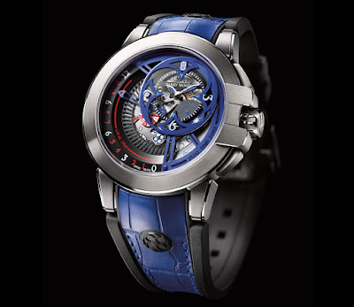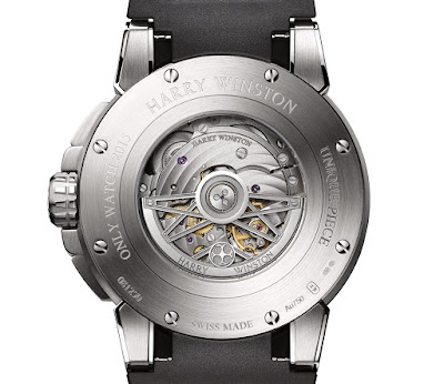 In einer Flut von Rot, Schwarz und Blau verziert, ist das eine von einer Art Ocean Dual Time Retrograde Harry Winston 's Eintrag für Charity Auktion Nur Watch. Es bietet Zwillingszeitzonen, lokale Zeit auf dem Sub-Zifferblatt um ein Uhr und zu Hause Zeit auf einem retrograde Indikator läuft von sechs bis 12 Uhr.